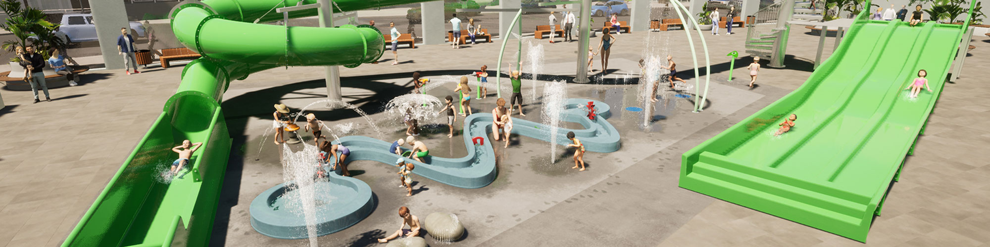 Es gibt viel zu tun! In der Hochsaison haben wir verschiedene Spray Parks, Wasserrutschbahnen und mehr gebaut. In diesem Herbst sind wir weiterhin damit beschäftigt, neue Projekte zu verwirklichen.