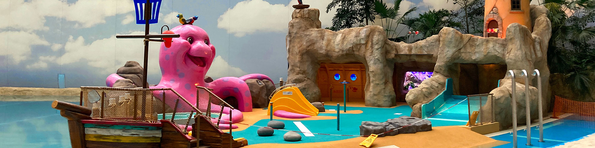Der Wasserspielplatz hat ein großes Thema. Der Riesenkrake umarmt die beiden Kleinkinderbecken mit seinen Tentakeln. Kleinkinder können auch auf das alte Schiffswrack klettern und auf einer der beiden Rutschen hinunterrutschen.