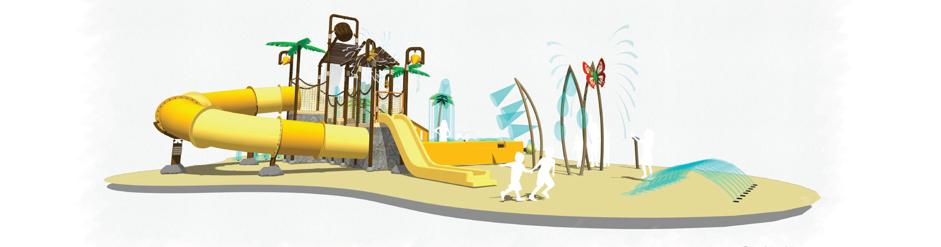 Für die etwas älteren Kinder sind im Entwurf mehrere Bodensprüher, etwas höhere Wasserspielelemente und einige niedrige Rutschen enthalten. Die ältesten Kinder können sich in der Spielstruktur mit großem Kippeimer, Wasserfall und Challenger-Rutsche austoben.