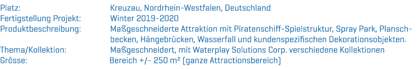 Die Attraktion erstreckt sich über eine Gesamtfläche von ca. 250 m². Das spektakuläre Herzstück ist das versunkene Piratenschiff, komplett mit Mast, (Wasser-)Kanonen und Ruder. Auf dem Heck beginnen zwei Wasserrutschen, die durch die Felsen führen. In einem der Felsen befindet sich ein Wasserfall. Die Hängebrücken erlauben den Besuchern, sich ganz nach dem Motto um die Attraktion herumzubewegen. Zu dem Projekt gehörte auch ein Planschbecken mit einer Rutsche und die entsprechende Dekoration. Sogar an transparente Folie an den Fenstern mit Themenbildern haben wir gedacht. Zu guter Letzt enthält die Wasserattraktion einen Abschnitt mit Spray Park-Elementen, darunter einige Bodensprüher, 2 Waterfalls und Kippkübel.