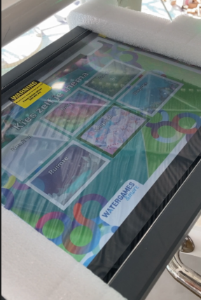 A competitive game can be played using numerous touch points. These are installed throughout the length of the slide. The more touch points a person hits, the higher their score. The score monitor at the end of the waterslide displays the score. This challenges visitors to try and improve their scores.