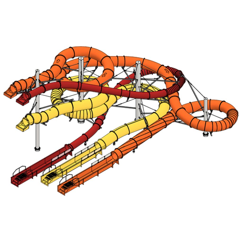 All three waterslides are both insulated and equipped with multimedia effects. Each comprises several touch points throughout its length. The slides’ interiors are fitted with LED lights that create rainbow effects.
