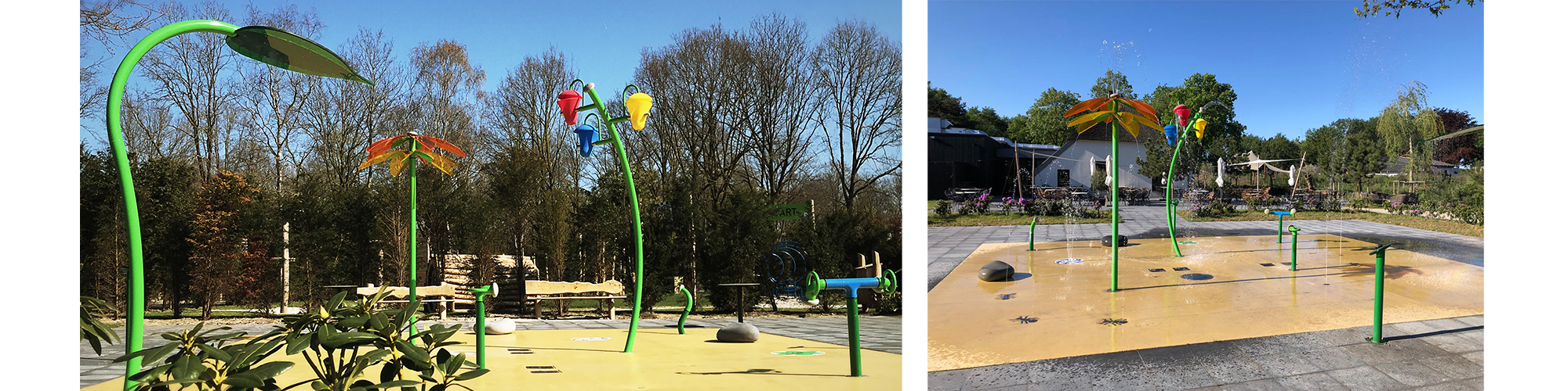 The holiday park was looking for a solution to increase the attraction value of the park, with an attractive investment budget. A Spray Park proved an excellent solution: the start-up, operating and maintenance costs are much lower than a swimming pool, for example, while the attraction value for guests is hugely increased.