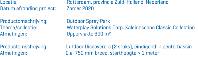 De verschillende elementen in het Spray Park dagen de kinderen uit om samen te spelen. Dit kun je goed terugzien bij de Splash Blasters. Dit zijn waterkanonnen waarmee kinderen elkaar nat kunnen spuiten. Met deze toestellen komen kinderen makkelijk in contact met elkaar en zullen ze snel samen spelen. Naast dat Familiepark Plaswijckpark zelf de verschillende toestellen kon kiezen, kon het park ook de kleuren zelf uitkiezen. Het park heeft onder andere gekozen voor de kleuren geel, groen en oranje. Dit zijn felle kleuren waar je ook echt vrolijk van wordt en waar het plezier er letterlijk vanaf spat. Het Spray Park is ruim opgezet en heeft veel verschillende toestellen, waardoor kinderen echt op avontuur zullen gaan en actief bezig zullen zijn met water.