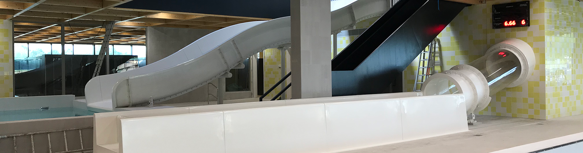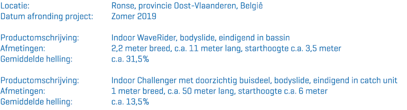 In Zwembad Ronse heeft Watergames & More in opdracht van Pellikaan Bouwbedrijf twee waterglijbanen gerealiseerd, een Challenger met een transparant buisdeel & multimedia en een WaveRider.